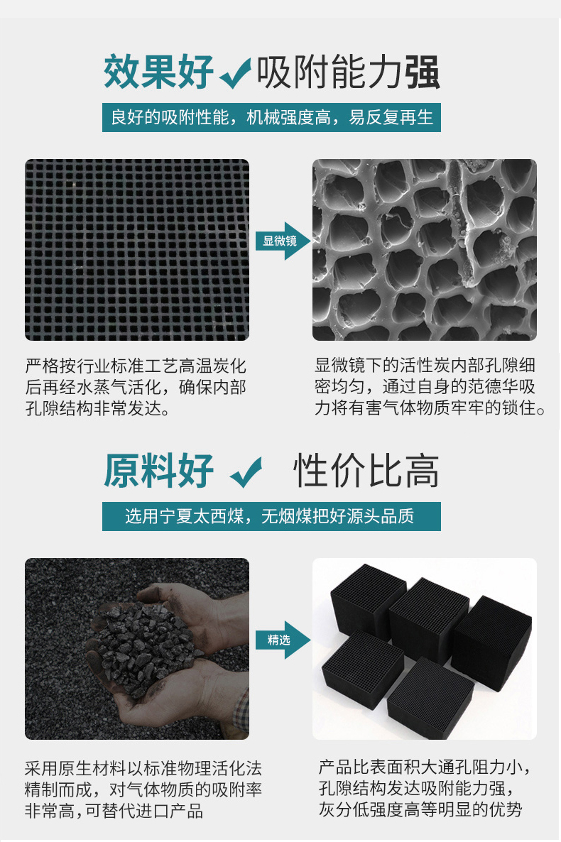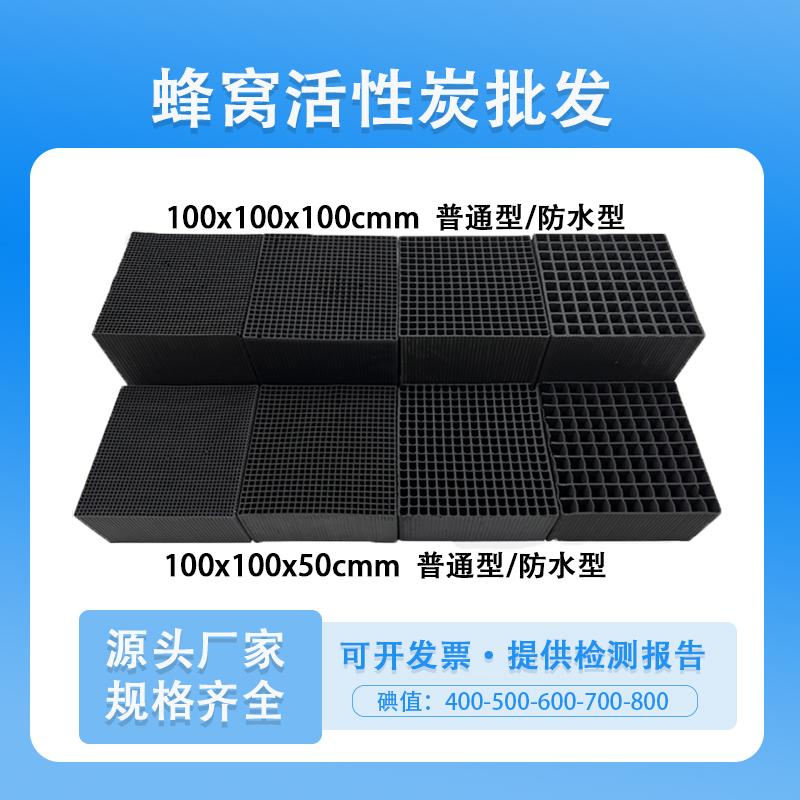 除了普通型號(hào)以及規(guī)格外還有針對(duì)用戶(hù)需要定制的特殊規(guī)格的蜂窩活性炭。要想能達(dá)到耐水性強(qiáng)的目的,巖燒處理過(guò)程也會(huì)對(duì)孔徑有調(diào)整??讖酱箫L(fēng)阻一般小,大孔徑對(duì)應(yīng)高風(fēng)量廢氣處理要求。通孔阻力小也有利于吸附作用,提高了活性炭與廢氣的接觸面積。
