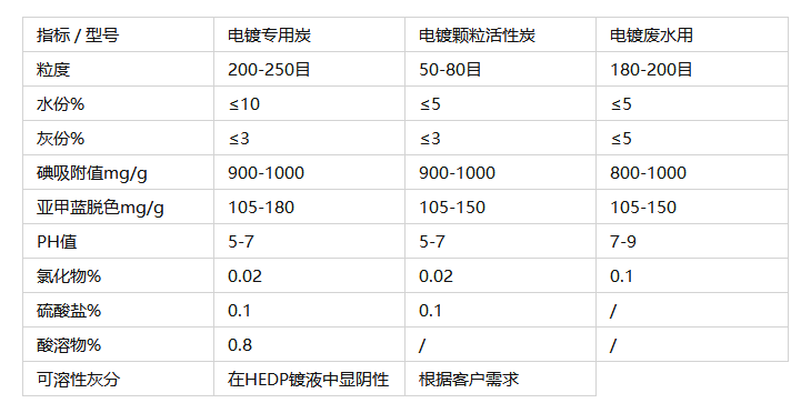 注:電鍍專用炭:可溶性灰分在HEDP鍍液中顯陰性,避免在處理電鍍?nèi)芤簳r(shí)產(chǎn)生雜質(zhì)而影響電鍍效果