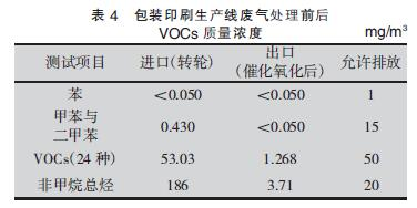 根據(jù)實際測量結(jié)果可知,沸石轉(zhuǎn)輪- 催化氧化裝置對大風(fēng)量低質(zhì)量濃度包裝印刷廢氣中VOCs 的去除效率高達98.01%,處理后的氣體符合允許排放質(zhì)量濃度的要求。