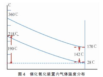 工況:入口氣體溫度T1=28 ℃,處理設(shè)備一次換熱氣體溫度T2=218 ℃,催化氧化后氣體溫度T3=360,廢氣余熱利用換熱后出口溫度T4=170 ℃。換熱溫度差值詳見圖4。