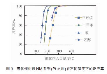 溫度不同時, 催化劑對VOCs 的處理活性效率也不同,因此需要尋找催化劑的最佳使用溫度。根據(jù)VOCs 廢氣中含有的主要有機揮發(fā)物(正己烷、二甲苯、苯、乙醇等物質(zhì)),在不同入口溫度條件下對其進行轉(zhuǎn)化率測試評價,結(jié)果見圖3。