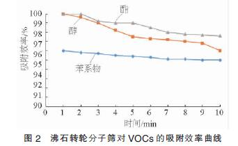 圖2表明,對于包裝印刷行業(yè)廢氣中含有的VOCs物質(zhì)(即苯系物、醇類與酯類物質(zhì)),疏水性分子篩均能進行有效吸附。